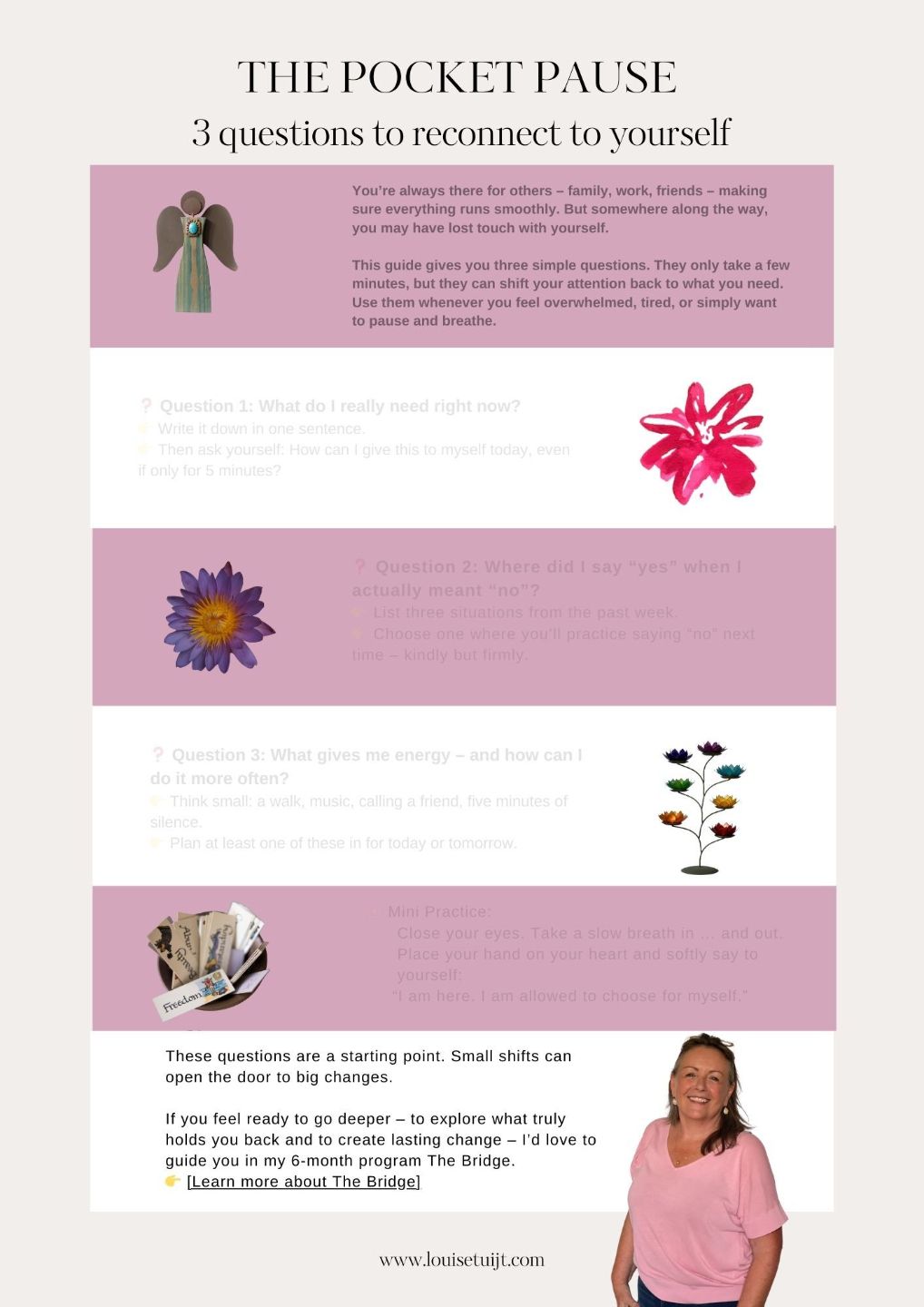 The Pocket Pause gives you 3 powerful questions to ground, reflect, and reset in under a minute. A simple tool to bring more clarity and calm into your day.